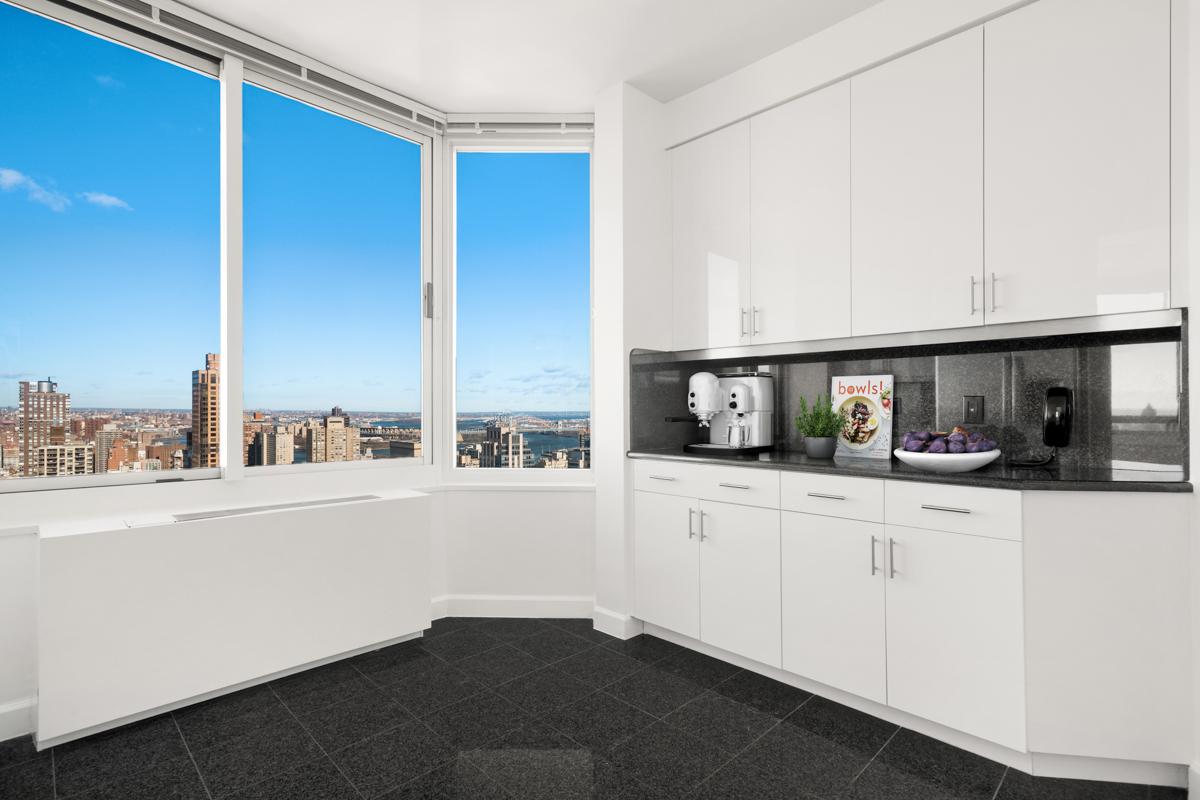 Sprawling four bedrooms plus four baths. Nine-foot ceilings, big windows expose the city panorama. Gracious entry flows into living plus separate dining room. Vented washer/dryer. Windowed eat-in kitchen, custom cabinetry, granite counter tops, stainless appliances. King sized main bedroom, windowed en-suite marble bath with double sink, jacuzzi tub, and stand-in shower. Fabulous closets including walk-in. Swimming pool, fitness center, playroom, lounge, garden terrace, roof top sundeck.